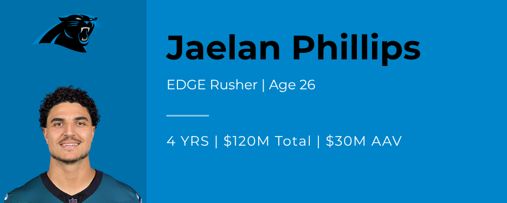 Phillips was the Panthers' first call when the negotiating window opened. Tilis and Morgan had identified the pass rush as the single biggest need on the roster heading into the offseason. Carolina finished 28th in the league in sacks in 2025 despite Derrick Brown posting a career-high 5.0 and rookie Nic Scourton showing promise. They needed a true edge rusher and they moved fast. The deal was agreed to within 49 minutes of the negotiating period opening.