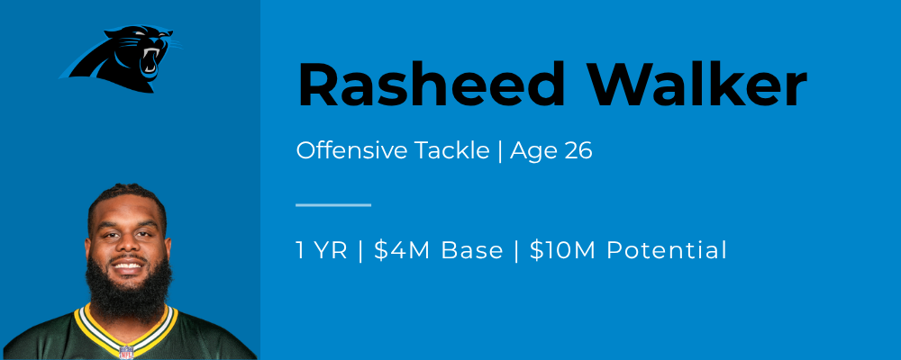 Walker has the potential to be a Pro Bowl left tackle and on a one-year deal, he gives Carolina a legitimate starting option at a position that needed answers after Ikem Ekwonu ruptured his patellar tendon in his right knee during the team's wild-card playoff loss to the Rams. The opportunity is there for both sides. This is smart roster management on a high value contract.